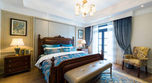 原木床和床头柜+海蓝花瓶+边框壁画+深色布品=复古实用美式主义